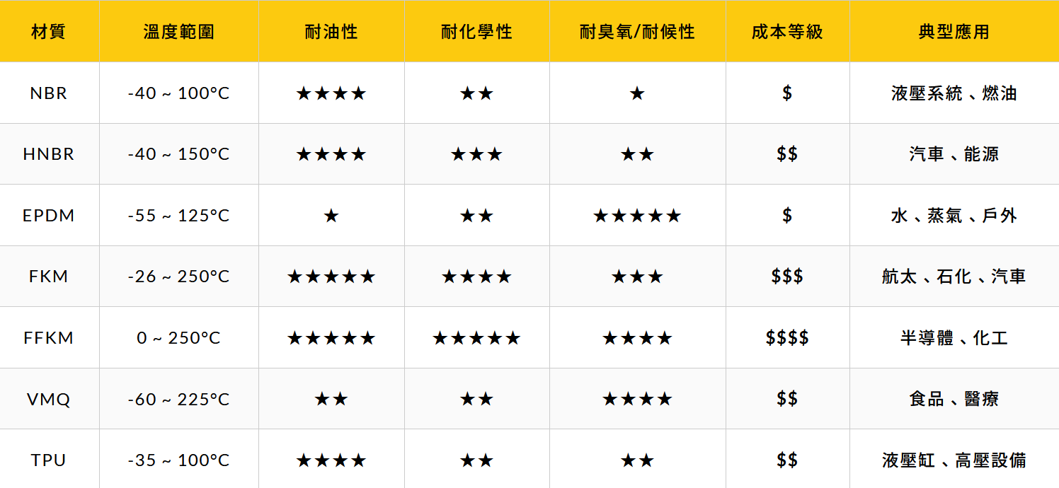 二、常見(jiàn) O-Ring 材質(zhì)與特性比較