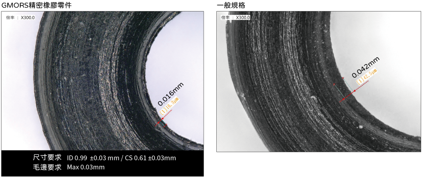 GMORS的精密O形圈技術最小量產(chǎn)尺寸可達內(nèi)徑0.50mm、線徑0.40mm,尺寸公差控制在正負0.01mm,毛邊控制在0.03mm內(nèi)的高精度水平。(圖1)