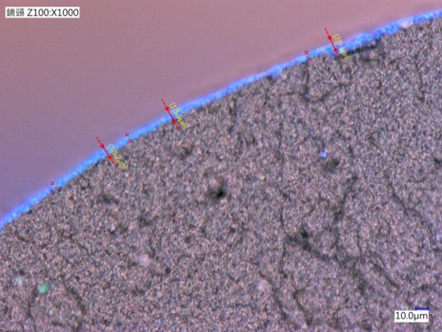 ?? 涂層厚度的量測(cè)如圖7所示。產(chǎn)品的橫截面必須進(jìn)行特殊處理以保持原始涂層的形狀,使顯微鏡可精確地測(cè)量厚度。測(cè)量/觀察微米厚的涂層需要高放大倍數(shù)。